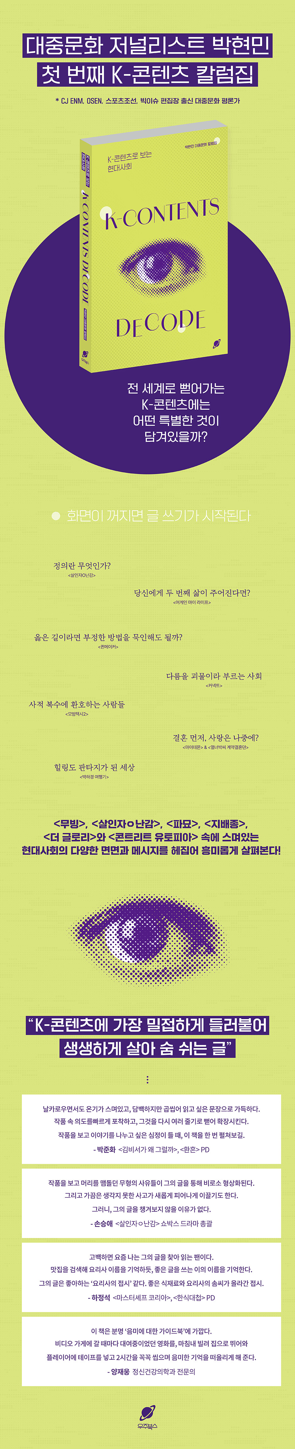 전 세계로 뻗어나가는 K-콘텐츠에는 어떤 특별한 것이 담겨있을까? 〈더 글로리〉와 〈이상한 변호사 우영우〉, 〈무빙〉과 〈피라미드 게임〉, 〈살인자ㅇ난감〉과 〈파묘〉 등 최근 국내외에서 크게 주목받은 K-콘텐츠를 통해 그 안에 숨겨진 현대사회의 면면들과 메시지를 헤집어 흥미롭게 살펴본다. 또한 이러한 일련의 과정을 거치며 콘텐츠를 단순히 소비하는 것에 그치지 않고, 능동적이고 면밀한 상호작용을 경험함으로써 유의미한 삶과 유익한 세상을 위해 사유하는 태도를 체득한다. 각종 미디어와 매체를 통해 대한민국을 대표하는 대중문화 전문가로 거듭난 박현민 평론가의 생생한 K-콘텐츠 칼럼집