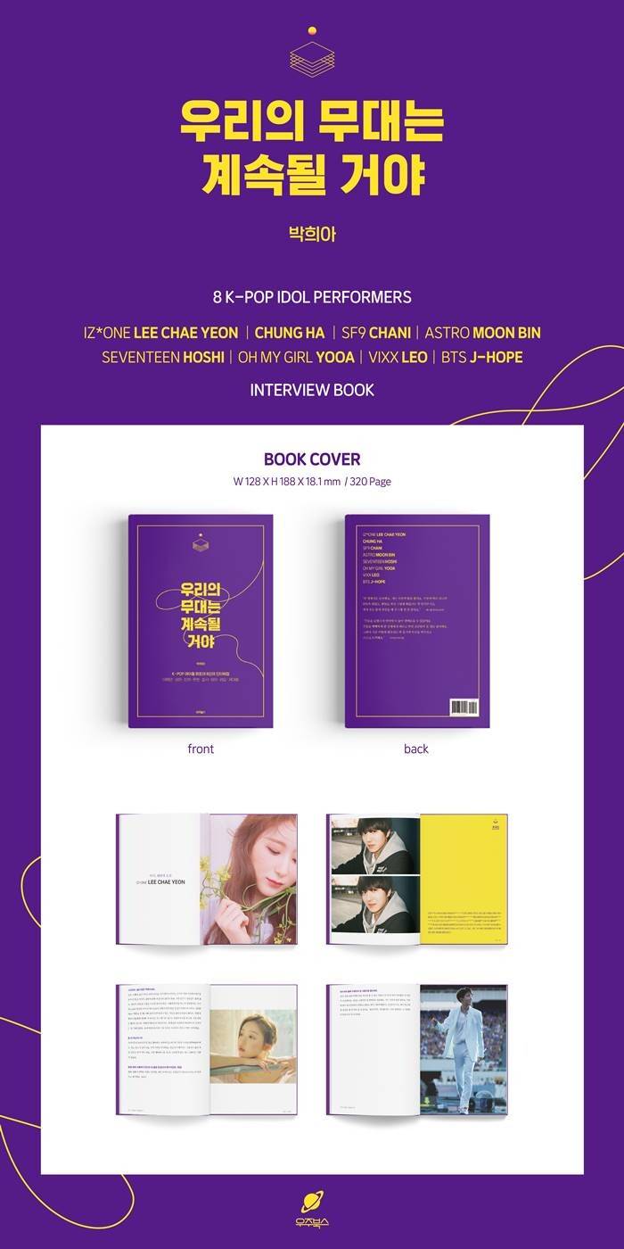 아이즈원 이채연, 청하, SF9 찬희, 아스트로 문빈, 세븐틴 호시, 오마이걸 유아, 빅스 레오, 그리고 방탄소년단 제이홉까지. 총 8인의 K-POP 아티스트의 목소리로 무대 위 퍼포먼스에 서린 그들의 땀과 노력, 그리고 마음을 인터뷰의 형태로 기록한 책입니다.